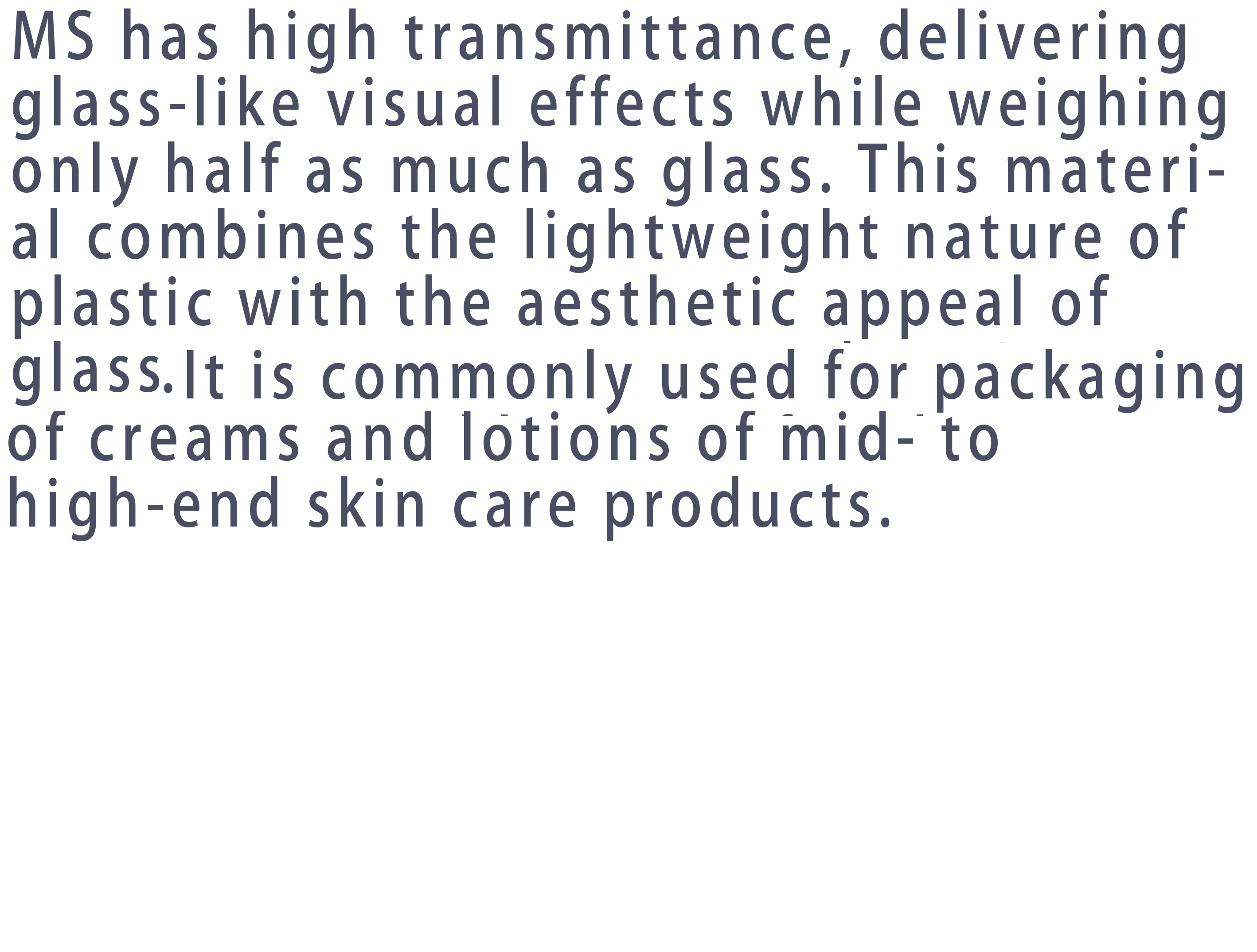 MS has high transmittance, delivering glass-like visual effects while weighing only half as much as glass. This material combines the lightweight nature of plastic with the aesthetic appeal of glass, making it ideal for elevating the premium quality of cosmetic packaging. It is commonly used for packaging of creams and lotions of mid- to high-end skin care products.